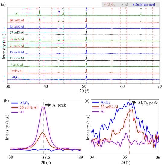 The following supporting information can be downloaded at: https://www.mdpi.com/article/10.3390/cryst13050850/s1, Figure S1: Particle size distribution of all compositions; Figure S2: X-ray patterns of the composite powders; Figure S3: SEM images of the precursor powder of all compositions; Figure S4: SEM images (left) and EDS mapping of oxygen (middle) and aluminum (right) for 7 vol%, 13 vol%, 15 vol%, 21 vol%, 60 vol%, and Al films; Figure S5: Comparison between the estimated Al volume fraction in the composite films and the nominal Al volume fraction in the powder mixtures prior to AD.