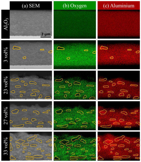 SEM images using a backscattered electron detector (a) and EDS mapping of oxygen (b) and Al (c) for Al2O3 film and composite films with 3 vol%, 23 vol%, 27 vol%, and 33 vol% of Al content. The regions highlighted in yellow indicate the Al phase within the Al2O3 matrix. Yellow lines are guides to the eye.