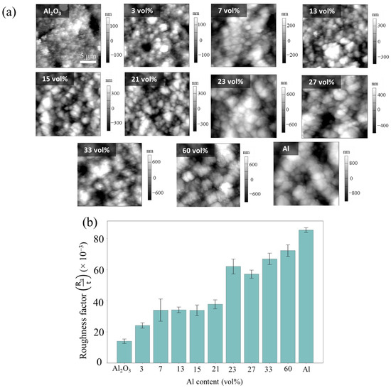 To better characterize the influence of the Al content within the Al2O3 matrix, the surface topography of the films was investigated using AFM, shown in Figure 3a. The roughness factors of the prepared samples, i.e., the ratio of the surface roughness (Rq) to film thickness (t), were calculated [33,34] and are shown in Figure 3b. It can be seen that the Al2O3 films have the lowest roughness factor of 15 × 10−3, while Al films show the highest roughness factor of 80 × 10−3. In composites up to 21 vol% of Al, the roughness factors do not exceed 40 × 10−3. However, an increase in roughness factor appears in films with ≥23 vol% of Al content, where the factors increase to over 50 × 10−3. This sharp increase suggests that Al is playing a more significant role in the structure of the films with ≥23 vol% of Al content.