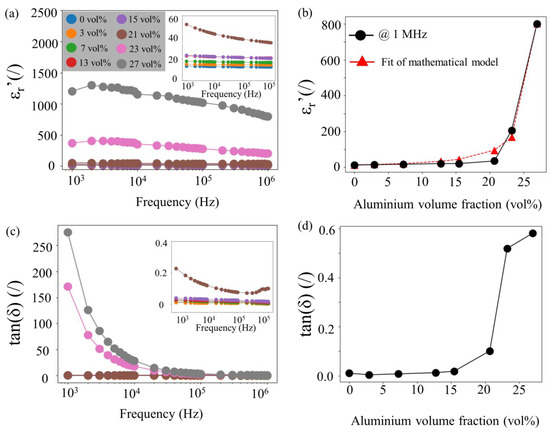 (a) εr’ of the composites as function of frequency, the inset shows εr’ up to 60. (b) εr’ at 1 MHz as function of Al content. (c) The tan(δ) as function of frequency, the inset shows tan(δ) up to 0.4. (d) tan(δ) at 1 MHz as function of Al content.