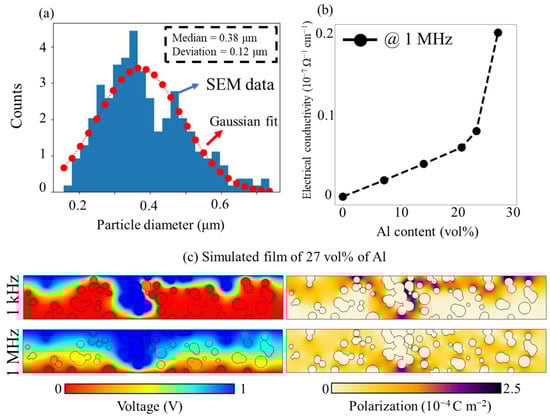 (a) Histogram of the diameter of embedded Al particles estimated from SEM images and the gaussian distribution used to generate the radius of the particles. (b) Electrical conductivity as function of compositions at 1 MHz, for different simulated compositions. (c) Simulation of a 27 vol% of Al film at 1 MHz. The voltage and polarization distributions are shown in the upper and lower panels, respectively.