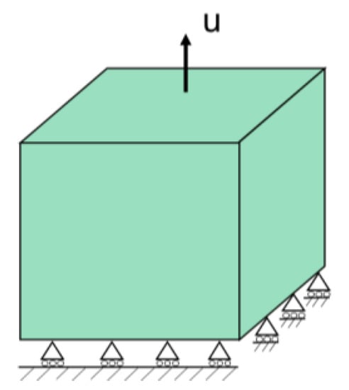 In this section, a single element is modeled to study the effect of β on crack-driving energy and phase field evolution. The model is a 1 mm × 1 mm × 1 mm element as shown in Figure 2. The axial displacement load and constraint are applied on the bottom and top surfaces, respectively. Table 1 shows the material and phase field parameters.