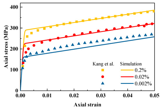 In order to verify the correctness of code writing for viscoplastic constitutive, we first simulate three stress–strain curves under strain rates 0.002%/s, 0.02%/s and 0.2%/s. The comparison of experimental data [44] and simulation is plotted in Figure 3. A typical strain rate-dependent effect is observed; the yield stress increases with a higher strain rate. From the perspective of dislocation theory, with the increasing strain rate, overcoming the material resistance of dislocation will take less time, which leads to dislocation density increase and further leads to high strength. The results show that this model can well describe the rate-dependent properties. However, compared with a high-strain rate, the predicted results are slightly worse at a very low-strain rate.