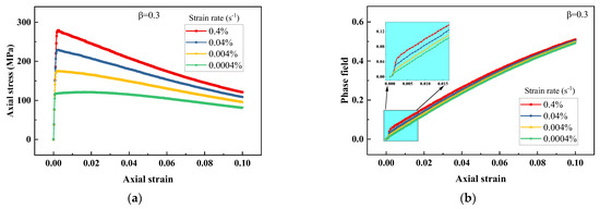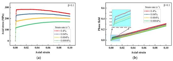 Viscoplasticity describes the rate-dependent behavior of materials; the strain rate affects the mechanical response of viscoplastic solids. Thus, in this subsection, four strain rate loads are selected to illustrate the rate-dependent behavior with the presented phase field model. The stress–strain and phase field-strain relations under different strain rate loads for β = 0.1 and β = 0.3 are shown in Figure 4 and Figure 5. Comparing Figure 4a with Figure 5a, the stress–strain curve becomes greater with increasing strain rate, which exhibits obvious viscoplastic characteristics. A larger value of β may cause greater damage to the stress, resulting from a larger inelastic energy contribution. In Figure 4b with Figure 5b, the phase field curve increases with the increasing strain rate. That is because higher stress may cause more driving energy to be produced under the same strain condition, resulting in greater damage.