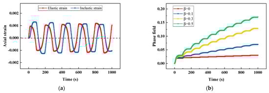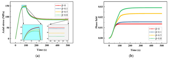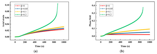 In the creep test, a force load is applied to the top of the model from zero to a fixed value within the first 100 s and then the force load keeps constant. Figure 6a,b show the curves of axial strain and phase field versus time for different values of β. The strain increases gradually under a constant force load, which is usually called the creep phenomenon. The axial strain and phase field increase with the increase of . The model tends to be fully broken when .