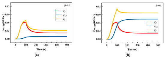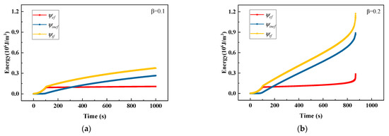 The evolution curves of driving energies of Equation (33) for and are plotted in Figure 7a,b. There is little difference between the elastic driving energies. Whereas the inelastic driving energy for is significantly larger than that for . For , the inelastic energy surpasses the elastic energy in a relatively long time (about 250 s); however, for , the inelastic energy surpasses the elastic energy in a relatively short time (about 180 s). This means that a larger value of can accelerate the phase field evolution. Whether or , once the inelastic energy begins to accumulate, it grows significantly faster than elastic energy. It indicates that the inelastic energy is dominant in driving phase field evolution.