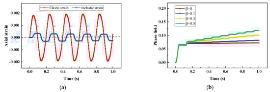 Response of viscoplastic material under high-frequency cyclic load: (a) strain-time relation for and (b) phase field-time relation for different values of β.