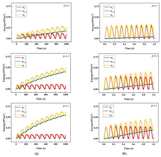 Crack driving energies of viscoplastic material under (a) low-frequency and (b) high-frequency cyclic load for different values of β.
