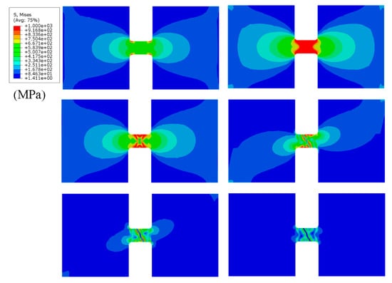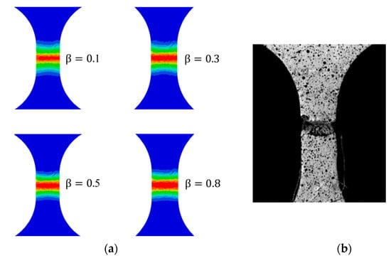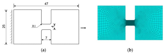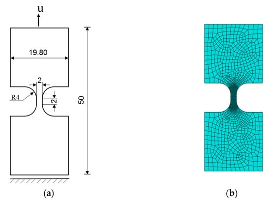 In this section, the fracture of a stainless-steel plate specimen with a thickness of 1.5 mm is studied using the presented phase field model. The tensile experiment used for comparison is taken from the literature [45]. The specimen was produced using an additive manufacturing method using the austenitic stainless-steel 316 L powder. The material and phase field parameters of the specimen are given in Table 2. The geometry and finite element discretization are illustrated in Figure 14. The effective element size in the area of crack growth is 0.1 mm. The geometry is meshed using 24,452 hexahedral reduced integration elements eight nodes. The displacement loading rate is 2 × 10−3 mm/s. The reaction force curves for different values of are plotted in Figure 15, in which the curve for agrees well with the experimental result, and a large value of can accelerate the fracture process. Figure 16 shows the final crack paths of the specimen for different values of . Red and blue colors indicate crack and unbroken materials. It is observed that the crack paths for different values of are similar; has no influence on the crack path for this stainless-steel plate specimen.