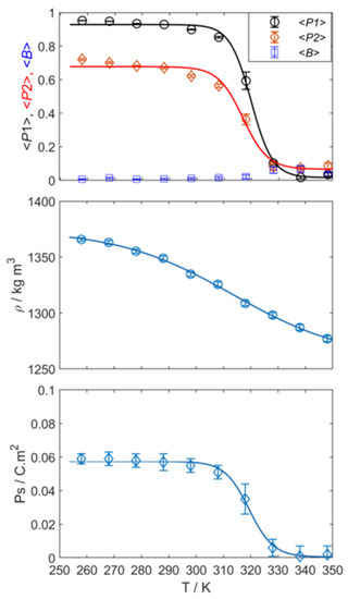 From top to bottom: simulation properties as a function of temperature: order parameters (<P1>, <P2>, and <B>); density, kg m3; and spontaneous polarisation, C·m2. Average values are given as data points, error bars show one standard deviation from the mean, and dashed lines are fits to the data which are presented as a guide to the eye. Fits take the form A + (B − A)/(1 + exp(−4 ∗ log(3) ∗ (x − c)/D)).