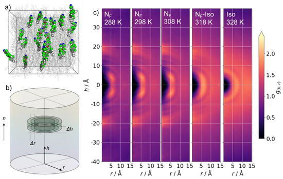 Simulations employed periodic boundary conditions in xyz. Bonds’ lengths were constrained to their equilibrium values with the LINCS algorithm [41]. During production MD simulations, the system pressure was maintained at 1 Bar using an anisotropic Parrinello–Rahman barostat [42,43]. Compressibilities in xyz dimensions were set to 4.5 × 10−5, with the off-diagonal compressibilities set to zero to ensure the simulation box remained rectangular. Simulation temperature was controlled with a Nosé–Hoover thermostat [44,45]. Long-range electrostatic interactions were calculated using the Particle Mesh Ewald method with a cut-off value of 1.2 nm. A van der Waals cut-off of 1.2 nm was used. MD trajectories were visualised using PyMOL 4.5. Q-tensor analysis was performed using MDTraj 1.9.8 [46]. Cylindrical distribution functions (CDF) were computed using the cylindr code. [47] Simulation densities, dipole moments, and volumes were obtained with the gmx energy program, with dipole and volume being used to compute spontaneous polarisation.