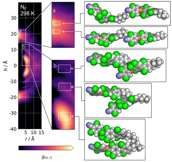 We start by considering the NF phase, the CDF of which presents as a concentric set of arc-like feature which result from preferred pairing modes. As can be seen in Figure 3, there are two major overlapping arc-like features located on the axis (i.e., r~0 Å) at h = ±~18–22 Å, which result from head-to-tail pairing. The major off-axis feature is a pair of lobes at r~5 Å and h~±5 Å, indicating a preference for staggered parallel pairs of molecules; additional off-axis arcs centred on r~5 Å (at h~±10 Å and h~±13 Å) result from analogous pairing modes with increased longitudinal intermolecular separation. As the temperature is increased, the features become less well-defined; for example, at a temperature of 288 K, we find two lobes at r~5.5 Å and h~± 5 Å, which converge to a single feature by 318 K.