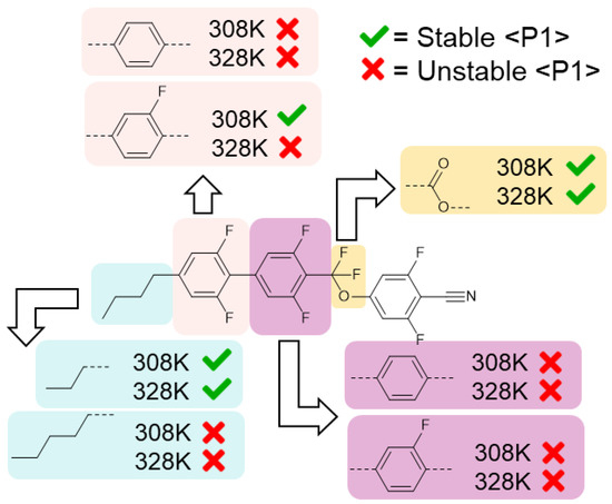 Firstly, we replaced one of the difluorobenzene rings of the biphenyl fragment of UUQU-4-N with either fluorobenzene or benzene, giving four variant materials (GUQU-4-N, PUQU-4-N, UGQU-4-N, and UPQU-4-N). We also generated a variant in which we replaced the difluoromethoxy linker with a carboxylate ester (a.k.a. UUZU-4-N), and two variants with either a propyl or pentyl chain in lieu of the butyl chain of the parent material (UUQU-3-N and UUQU-5-N, respectively). For each structure, we generated GAFF parameters with RESP charges as described for UUQU-4-N, with the initial MD configurations of 500 molecules then subjected to the same energy minimisation and equilibration protocols. We obtain polar nematic configurations by applying a static electric field. Finally, we perform a 250 ns production MD simulation at temperatures of 308 K and 328 K, i.e., 10 K above and below the simulated NF–Iso point in the parent material. If the variant exhibits a stable polar nematic order at 328 K, it has an enhanced propensity to generate an NF phase relative to the parent, with the inverse argument being true of variants whose polar nematic ordering decays to an isotropic liquid at 308 K. We judge a phase as stable when its polar order parameter (<P1>) does not vary by more than 10% from its initial value (which was >0.9 in all cases).