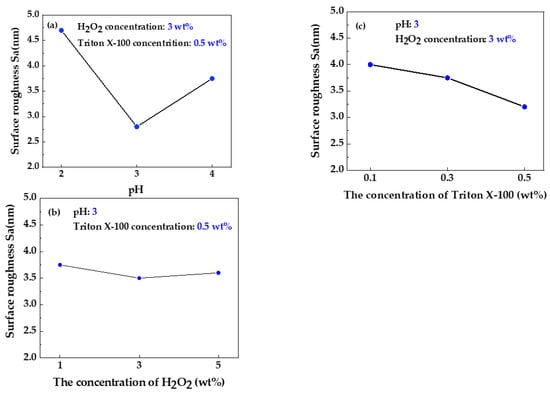 The surface roughness findings vary between the three levels of the factor, as determined by the range analysis of each parameter. To put it another way, the higher the extreme difference value, the more significant an impact the factor has on the experimental results, but the lower the range analysis value, the less significant an effect the factor’s three levels of results have on surface roughness. From the experimental results in Table 4, it can be inferred that pH plays a crucial role in surface roughness, follows by Triton X-100 concentration and that H2O2 concentration had the least impact on the results. Since RA > RC > RB, it is indisputable that pH has a significant effect on surface roughness. Through orthogonal experiments, we learned that the best experimental values obtained for the three factors were pH of 3, hydrogen peroxide content of 3 wt%, and Triton X-100 of 0.5 wt%, respectively. To further validate the experimental results, a single-factor test method, and orthogonal experimental results validation were then used for comparison. The specific details are presented in Figure 2.