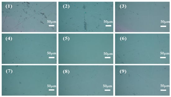 The results and analyses of the orthogonal tests had shown that pH = 3, H2O2 concentration of 3 wt%, and Triton X-100 concentration of 0.5 wt% were the three components’ ideal values. Nine sets of orthogonal trials yielded the microscope images of the 4H-SiC substrate of Si face morphology shown in Figure 3. In groups 1, 2, and 9, the 4H-SiC substrate of the Si face had all undergone considerable scratching to varying degrees. Experiments (1) and (2) showed the most pronounced surface dings and grooves. When the pH of the 4H-SiC substrate of the Si face was 2, the local chemical corrosion was intense under the influence of strong acid during the CMP process, causing the 4H-SiC substrate of the Si face to develop grooves and scratches. Due to the reduced interfacial mechanical interaction of the surfactant and the accelerated oxidation of the hydrogen peroxide, the higher concentrations of Triton X-100 and H2O2 utilized in Experiment (3) produced a significantly superior 4H-SiC substrate of Si face than in Experiments (1) and (2). The 4H-SiC substrate of Si face quality of experiment (5) was the best; at pH = 3, the chemical effect was less pronounced than before, which was consistent with the results of other experiments. The combination of Triton X-100 and hydrogen peroxide may further enhance the 4H-SiC substrate of Si face quality.