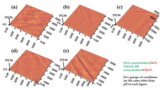 Figure 5 depicted the three-dimensional surface morphology of AFM after polishing the 4H-SiC substrate of the Si face with distinct methanol pH levels. Five groups of conditions are the same other than pH in each figure. H2O2 concentration is 3 wt% and the Triton X-100 concentration is 0.5 wt%. The pH in Figure 5a is adjusted at 2, the pH in Figure 5b is adjusted at 3, the pH in Figure 5c is adjusted at 4, the pH in Figure 5d is adjusted at 4, the pH in Figure 5d is adjusted at 5, and the pH in Figure 5e is adjusted at 6.67. It is clear from Figure 5 that after polishing the 4H-SiC substrate of Si face with various pH levels, the surface quality radically changed and the surface morphology differed dramatically. The surface quality improved overall after the addition of oxalic acid, and the scratches and bumps were reduced in turn. Particularly at pH = 3, the substrate surface was the flattest, without obvious scratches and bumps, and the surface roughness was also the lowest, which was owing to the appropriate amount of oxalic acid being added at this time. A flattened surface is produced as a result of the mechanical action of the diamond abrasive grains on the hydrophilic self-conditioning fixed abrasive pad, which effectively counteracts the creation of a film on the 4H-SiC substrate of the Si surface. It was important to note that surface grooves and bumps were severe at pH = 2, which may be the result of a surface quality decline brought on by severe local chemical corrosion.