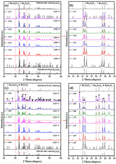 XRD patterns of BaSixO1+2x (1.61 ≤ x ≤ 1.90) ceramics sintered at their densification temperature: (a) the XRD patterns of BaSixO1+2x (1.61 ≤ x ≤ 1.67) ceramics; (b) the enlarged XRD patterns of BaSixO1+2x (1.61 ≤ x ≤ 1.67) ceramics at 20°~30°; (c) the XRD patterns of BaSixO1+2x (1.68 ≤ x ≤ 1.90) ceramics; (d) the enlarged XRD patterns of BaSixO1+2x (1.68 ≤ x ≤ 1.90) ceramics at 20°~30°.