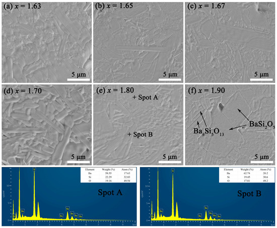 As shown in Figure 3 and S1, the thermally etched SEM and EDS map scanning images of BaSixO1+2x (1.61 ≤ x ≤ 1.90) ceramics were obtained. The dense and smooth microstructures of BaSixO1+2x (1.61 ≤ x ≤ 1.90) ceramics were observed. Only the grains of barium silicates were observed in BaSixO1+2x (1.61 ≤ x ≤ 1.90) ceramics. However, the similar monoclinic structure and elemental composition caused difficulty in distinguishing the grains of Ba5Si8O21 and Ba3Si5O13 based on Figure 3 and S1. In Figure 3e, the EDS results of Spots A and B indicated that the strip-shaped (Spot B) and large (Spot A) grains were Ba3Si5O13 and BaSi2O5, respectively. The Ba3Si5O13 second phase can be observed in Figure 3f. With the increase in x, the content of strip-shaped grains decreased gradually and the average grain sizes increased, which implies that the content of BaSi2O5 rose gradually.