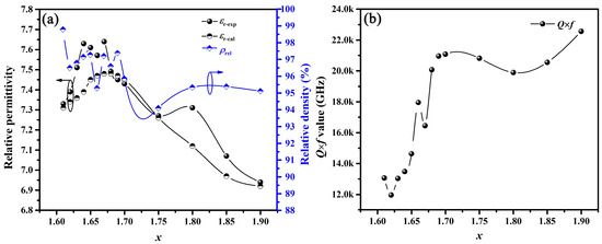 (a) Variation in εr-exp, ρrel and εr-cal of BaSixO1+2x (1.61 ≤ x ≤ 1.90) ceramics with x; (b) variation in Q × f values of BaSixO1+2x (1.61 ≤ x ≤ 1.90) ceramics with x.