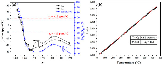 with the increase in measured temperature, the length of BaSixO1+2x (x = 1.63) ceramics increased gradually, and the average linear thermal expansion coefficient (CTE in Figure 5b) at 25–750 °C is 10.1 ppm/°C. The dependence of εr on temperature for BaSixO1+2x (1.61 ≤ x ≤ 1.90) ceramics is shown in Figure 6, and the fitting τε values at 30–125 °C and 1 MHz were obtained. The negative τε values were obtained in BaSixO1+2x (1.61 ≤ x ≤ 1.64) ceramics, and BaSixO1+2x (1.66 ≤ x ≤ 1.90) ceramics exhibited positive τε values. At 1.61 ≤ x ≤ 1.64, the negative τε values increased gradually to near zero, and BaSixO1+2x (x = 1.64) ceramics exhibited a near-zero τε value (−2.9 ppm/°C). At 1.66 ≤ x ≤ 1.90, the small τε value was obtained in BaSixO1+2x (x = 1.80) ceramics. According to the τf–εr relationship, a similar variation in the τε and τf values of the BaSixO1+2x (1.61 ≤ x ≤ 1.90) ceramics was observed as x increased, which indicates that the measured τf-exp values using the Hakki–Coleman method were exacted. The measured αL (10.1 ppm/°C) and τε (−15.4 ppm/°C) values of BaSixO1+2x (x = 1.63) ceramics also confirmed their near-zero τf-exp value.