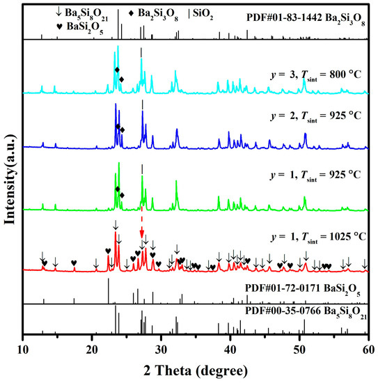At high Tsint (≥1300 °C), the phase compositions of BaSixO1+2x (1.61 ≤ x ≤ 1.90) ceramics were revealed in this work. However, the phase compositions of barium silicates were sensitive to Tsint, and the complex phase transformation of barium silicates existed with the change in Tsint, especially Ba5Si8O21, Ba3Si5O13 and BaSi2O5 ceramics [9,10]. Thus, the phase transformation of BaSixO1+2x ceramics with the change in Tsint must be clarified. The BaSixO1+2x (x = 1.63) ceramics sintered at 1300 °C presented the coexistence of Ba5Si8O21 and Ba3Si5O13 phases and exhibited good microwave dielectric properties. As shown in Figure 7, the XRD patterns of BaSi1.63O4.26-y wt% LiF (1 ≤ y ≤ 3) ceramics were obtained. The coexistence of Ba5Si8O21 and BaSi2O5 phases was obtained in BaSi1.63O4.26-1 wt% LiF ceramics sintered at 1025 °C, and the Ba3Si5O13 second phase of BaSi1.63O4.26 ceramics sintered at 1300 °C was inhibited. However, the new Ba2Si3O8 and SiO2 second phases appeared in BaSi1.63O4.26-1 wt% LiF ceramics when Tsint = 925 °C, which implies that the Ba2Si3O8 and SiO2 phase can transform into BaSi2O5 phases at Tsint = 1025 °C. With the increase in the content of LiF, the Tsint of BaSi1.63O4.26-y wt% LiF (1 ≤ y ≤ 3) ceramics decreased gradually. The coexistence of Ba5Si8O21, Ba2Si3O8, BaSi2O5 and SiO2 phases was observed in BaSi1.63O4.26-y wt% LiF (y = 2, 3) ceramics sintered at 925 and 800 °C.