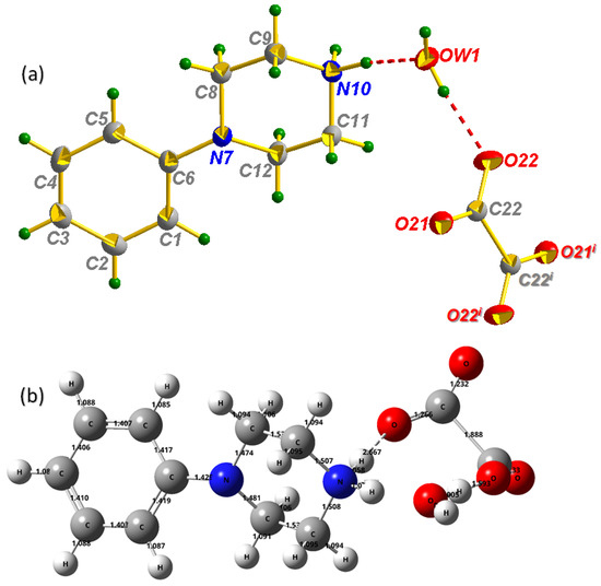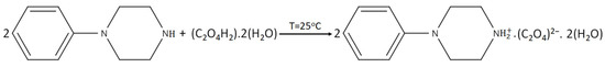 Oxalic acid is an interesting organic matrix; it has great importance because of its interaction with the human body, animals and microorganisms [22]. It is an acid that is naturally produced in the human body when glycine and ascorbic acid are metabolized [22,23]. This acid is also present in many plants; it is produced by the metabolic conversion of ascorbic acid into oxalic acid [24]. The high content of oxalic acid in the human body may have a number of functions in the infection process, including chelation of calcium from cells and making pectic fractions more available to fungus. It is important to know that only plants are able to metabolize oxalic acid and oxalates [25,26]. The important roles and properties of oxalic acid provide the background for this work to pair it with 1-phenylpiperazine to create an anti-oxalate compound and for study of the interaction between these components.