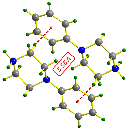The contributions of hydrogen bonds to the construction of three-dimensional networks are classified as follows: N-H…O bonds with distance donor…acceptr ranging from 2.6781 (18) to 2.9386 (17) Å, O-H…O bonds with ddonor…acceptor varying from 2.6989 (17) to 2.7040 (16) Å and C-H…O bond ddonor…acceptor = 3.447 (2) Å. According to Brown’s criterion, O-H…O bonds between oxalate anions and water molecules are considered as strong H-bonds (ddonor(O)…acceptor(O) < 2.73 Å) [30]. The geometry of the different existing H-bonds for the synthesized compound is given in Table 3. Oxalate anions and water molecules are attached by O-H…O hydrogen bonds (Figure 2b); this phenomenon will be repeated until a new supramolecular unit of type (26) is formed [31], which plays an important role in maintaining the crystal structure. With a distance value of 3.56 Å, Figure 3 allowed us to show the existence of C-H⋯π interactions between the organic groups, which contribute to the stability of the crystal structure; thus, the conditions for the existence of this type of interaction are verified [32].