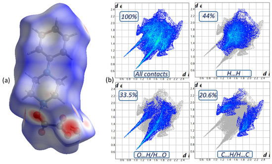 The Hirshfeld surface of PPOXH in dnorm mode (a) and two-dimensional fingerprint plots of intermolecular contacts (b).