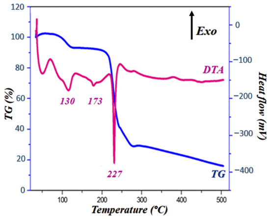 Notably, the TG curve shows that this compound is stable up to 90 °C and it undergoes two stages of mass loss, one of which is 9% at 130 °C, which corresponds to the release of two crystallization water molecules (dehydration), and the other loss of mass is 51% which extends from 220 °C to 250 °C. The DTA curve gives three endothermic peaks; a first peak located at 130 °C that describes a dehydration accompanied by a loss of mass as it is presented in the TG curve. The second peak, at around 173 °C, corresponds to a PPOXH melting, justified by the absence of a mass loss on the TG curve. At the end, the third peak which reflects the decomposition of the rest of the product around 227 °C, coupled with a loss of mass which is confirmed by TG.