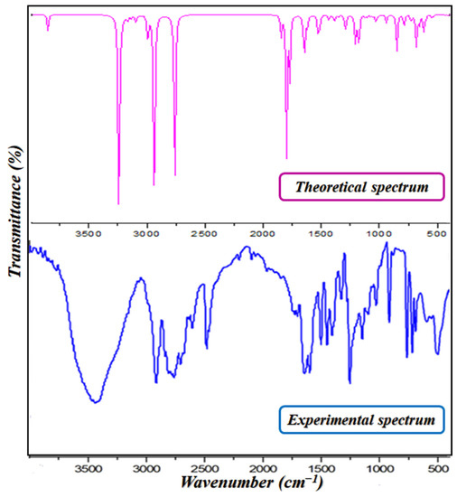 Infrared spectroscopy (IR) allows us to identify the functional groups in the structure of PPOXH. Figure 6 shows the experimental and theoretical FT-IR spectrum of PPOXH, where the observed bands are recorded between 4000 and 400 cm−1. In this way, our synthesized compound is in agreement with other referenced IR studies [36,37]. The presence of a small disagreement between the two spectra is explained by the fact that the FTIR spectrum was expressed in the crystalline state while the theoretical spectrum was analyzed in the gas phase.