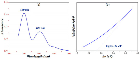 The UV-visible spectroscopy also allows us measure the energy gap of PPOXH. Tauc proposed an extrapolation method that allows us to determine the Eg from the variation of (αhν)2 as a function of hν [38], as shown in Figure 7b, which indicates that PPOXH, with its value of Eg = 2.34 eV, can act as a semiconductor.