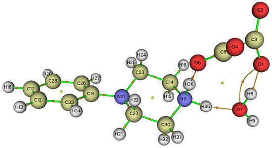 Graphical representation of the AIM analysis of PPOXH (the critical binding points (BCP) and the connection paths are represented respectively by small balls and orange lines).