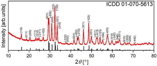 Figure 1 shows the diffraction pattern for the Y1.9Dy0.1SiO5 powder sample, which corresponded to a monoclinic crystal structure with the P21/c space group. All the diffraction peaks matched well with the ICDD card no. 01-070-5613, with no peaks indicating impurities or the formation of other phases. Since the ionic radii of the Y3+ and Dy3+ were very similar (1.027 Å and 1.019 Å, respectively), the X-ray pattern indicated that the Dy3+ was successfully incorporated into the Y2SiO5 crystal lattice. Using the built-in PDXL2 software, the average crystallite size and structural parameters (Table 2) were determined; the initial parameters for the analysis were obtained from [33].