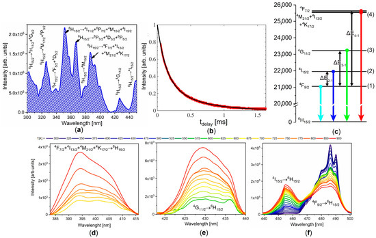 Temperature-induced changes in the luminescence of materials manifest in a variety of ways, such as altered emission intensity, the luminescence intensity ratio (LIR) between two emission peaks, the spectral positions of the excitation and emission bands, and excited-state lifetimes. All these alterations can be used for efficient temperature detection with a method known as luminescence thermometry [1,2,3]. The LIR is the most extensively used method in luminescence thermometry [4]. It plays an important role because it is self-referential and uses ratios of absolute emission intensities to avoid issues brought about by changes in measurement conditions, such as fluctuations in the excitation. When applied with lanthanide-activated phosphor probes, LIR is frequently constructed by utilizing emissions from two excited energy levels that are thermally coupled and with populations that follow the Boltzmann distribution. For this reason, the method is also known as Boltzmann thermometry. Two excited energy levels are thermally coupled when their energies are close and the nonradiative transition rates between them exceed the radiative transition rates within the thermometer’s operating range [5]. The temperature dependence of the LIR is then described by a simple exponential dependence on inverse temperature that has the form of the Boltzmann-distribution equation [6], and, accordingly, the relative sensitivity of the method, is linearly dependent on the difference in energy between emitting levels and inversely proportional to the temperature square [7,8].