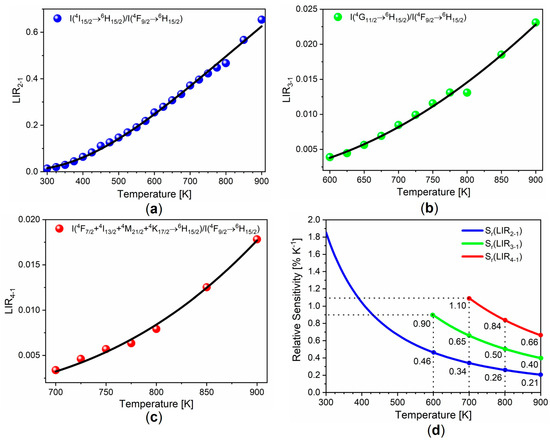 The conventional LIR approach uses the emissions from two neighboring excited levels. For Dy3+, it is constructed from the 4I15/26H15/2/4F9/26H15/2 emissions-intensity ratio. We denote it here as LIR2-1, with the corresponding difference in energy among the levels of ΔE2-1 (see Figure 2b). It was measured over the entire temperature range (300–900 K), and it is represented graphically in Figure 3a. The fit of Equation (1) with the experimental data is depicted with a solid line in Figure 3a, while the data obtained from the fit are provided in Table 3. According to Equation (3), the relative sensitivity of the method was 1.85% K−1 at 300 K (around room temperature) but decreased almost ninefold to 0.21% K−1 at 900 K (Figure 3d).