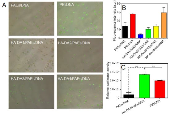 (A) Merged pictures of fluorescent images and bright-field images of cells after incubating with PAEs/DNA (40:1), PEI/DNA (40:1) or HA-DA/PAEs/DNA (10:40:1) for 4 h. The DNA concentration was fixed at 0.5 μM. (B) Quantified flow cytometry intensity for different treatment groups. (C) Gene expression level for PAEs/DNA, HA-DA4/PAEs/DNA and PEI/DNA in A549 cells. ** p < 0.01.