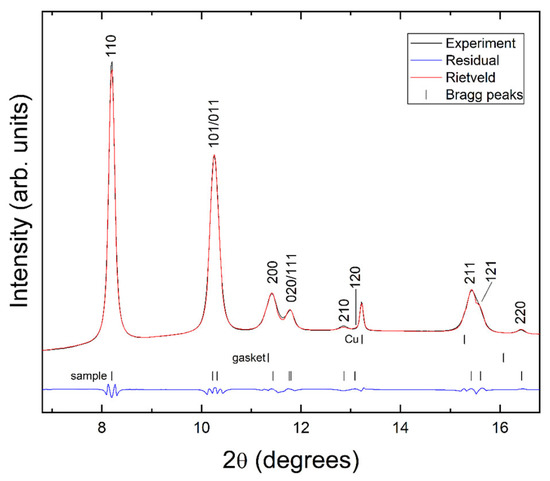 Figure 3 shows a selection of XRD patterns of nanocrystalline Co-doped SnO2 at representative pressures. There are no noticeable changes in the diffraction patterns up to 13 GPa aside from the shift of peaks to higher angles due to the typical contraction of unit-cell parameters under compression. All the XRD diffraction peaks up to 13 GPa could be successfully indexed considering only the low-pressure (LP) rutile-type phase and copper. In addition to the peaks assigned to SnO2, a peak due to copper (marked by *), which was used to determine the pressure, can be identified in all the X-ray diffraction profiles. We observed a systematic shift in all the diffraction peaks to a higher 2θ due to lattice compression. At 14.2 GPa, we observed few discernible changes in the XRD diffraction profile, which we consider to be indicative of a phase transformation. In addition, we found that at 14.2 GPa, the cell metric is no longer consistent with P42/mnm symmetry, and another crystallographic phase with Pnmm symmetry occurs, corresponding to an orthorhombic CaCl2-type structure. In particular, at the pressure of 14.2 GPa, the broadening of the (101), (200), and (111) diffraction peaks of rutile, in addition to the splitting of the (211) diffraction peak of rutile, were observed. The XRD diffraction profiles at 14.2 GPa and higher pressures could not be well indexed to tetragonal rutile-type phase. To make the changes in the XRD patterns indicating the structural phase transition more evident for the readers, we provide in Figure 4 an enhanced view of the XRD patterns measured at 13.0, 14.2, and 20.2 GPa. In Figure 4, it is clear that the (211) peak of rutile gradually splits into two different peaks. The same happens with peak (111). Another fact highlighted by Figure 4 that could not be explained by assuming the tetragonal rutile-type structure is the evolution of the (200) peak of rutile towards low angles as the pressure increased beyond 13.0 GPa. This can only be explained by assuming a decrease in the crystal symmetry from tetragonal to orthorhombic. Indeed, we found that the orthorhombic CaCl2-type structure provides the correct positions of all diffraction peaks, as indicated by unbiased Rietveld refinements. An example of this can be seen in Figure 5, where we show the Rietveld refinement we performed at 14.2 GPa. Furthermore, the proposed rutile-CaCl2 structural phase transition agrees with earlier investigations on rutile SnO2 [17,18,19,20].