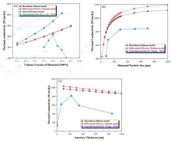 Comparison of thermal conductivity calculated by different models with experimental data: (a) Volume fraction of diamond; (b) diamond particle size; (c) interface thickness. The experimental data in Fig. 1a are from Ref. [19]; the experimental data in Fig. 1b are from Ref. [20]; the experimental data in Fig. 1c are from Ref. [21].