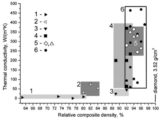 Thermal conductivity of copper-based diamond composites with different diamond size combinations. The composite densities are normalized to that of single crystal diamond. 1—100% nanodiamonds; 2—50% 10~14 μm diamonds and 50% nanodiamonds; 3—85% 10~14 μm diamonds and 15% nanodiamonds; 4—100% 5~7 μm diamonds; 5—99.5% 10~14 μm diamonds and 0.5% fullerenes combined with data on 99% 10~14 μm diamonds and 1% nanodiamonds; 6—100% 10~14 μm diamonds. Copyright 2007, with permission from Elsevier [26].