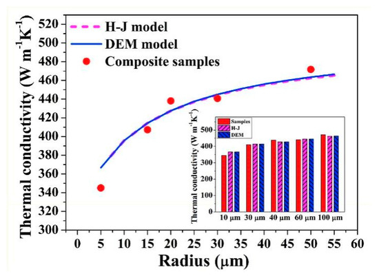 The thermal conductivity of particle-reinforced composites can be measured more accurately by using the Hasselman–Johnson model, which was developed on the basis of the Maxwell theoretical model [16]. The Hasselman–Johnson model is widely used to predict and analyze the thermal conductivity of particle-reinforced composites. The equation for the Hasselman–Johnson model is given as [16]: