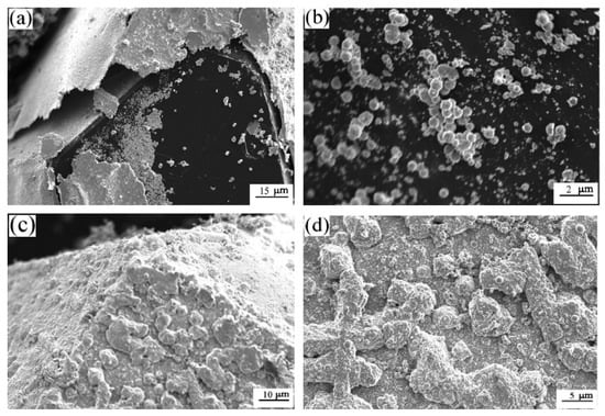 Electroplating (EP) is the process of depositing metal on a surface, which is plated by a reduction reaction in the absence of an external power source and the presence of a strong reducing agent. Through electroplating, metal can be deposited on diamonds in a physical encapsulation process that creates no metallurgical bonds. Therefore, to improve the density of copper-based diamond composites, the diamond surface is usually coated with the active elements by other methods, and then coated with copper by electroplating. C. Zhang [47] prepared copper-based diamond composites with high densities and good thermal properties by designing a bilayer structure on diamond particles. The diamond surface was first coated with tungsten, and then coated with copper. H. Li [48] used a molten salt containing NaCl, KCl, and NaF to form a thin TiC coating on diamond, followed by chemical copper plating. The double coating (TiC-Cu) improved the thermal performance of diamond/Cu composite materials. The TC of diamond (60 vol%)/Cu composite material reached 495.5 W/(m·K), which was much higher than Cu, and slightly lower than the values predicted by the H–J model and DEM. Y. Pan [33] prepared copper-based diamond composites with good thermal conductivity using another method. They coated tungsten as the inner layer using salt bath plating, and then coated copper as the outer layer using chemical plating. As can be seen from Figure 8, the copper layer obtained by simply plating copper on the diamond surface tended to peel off [33]. In the case of first plating tungsten, the copper adhered more easily to the diamond surfaces. However, the method has several disadvantages, for example, this method requires a high external surface for the diamond particles. Thus, the diamond surface of specimens must be pretreated as mentioned above to ensure a better bond between the diamond and the plating layer. Another problem is that the use of strong reducing agents promotes graphitization of diamond.