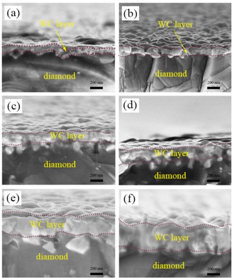 Cross-section microstructures of the WC layers with different thicknesses on diamond plates: (a) 70 nm; (b) 117 nm; (c) 179 nm; (d) 231 nm; (e) 320 nm; (f) 400 nm. Copyright 2022, with permission from Elsevier [49].