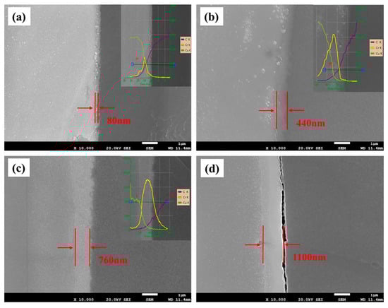 The interface microstructures and corresponding line scanning of copper-based diamond composites with different Cr contents: (a) 0.3 wt% Cr; (b) 0.5 wt% Cr; (c) 0.7 wt% Cr; (d) 1.0 wt% Cr. Copyright 2021, with permission from Elsevier [35].