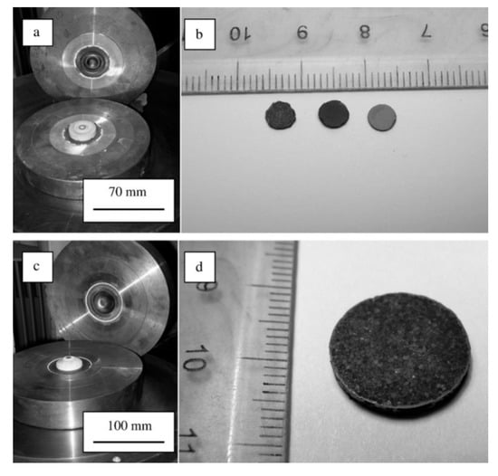 HPHT devices and composites produced with them: (a,b) toroid-type; (c,d) anvils-with-depression type apparatus. Copyright 2008, with permission from Elsevier [11].