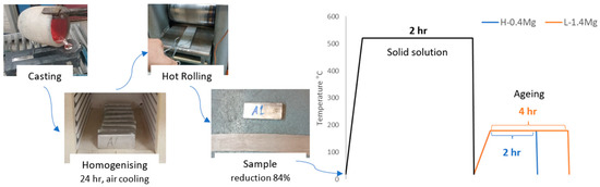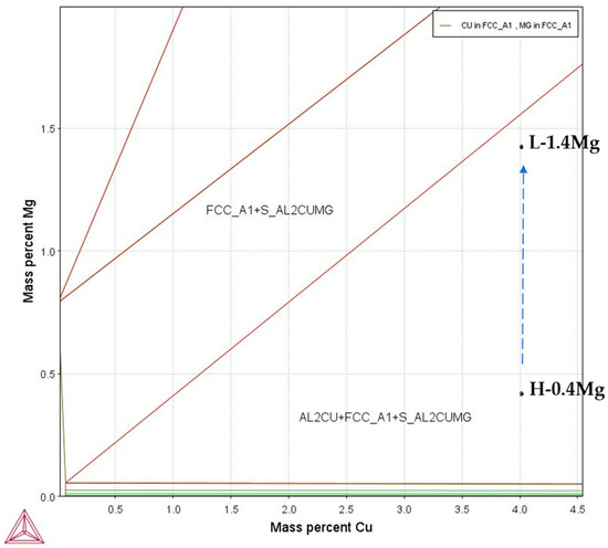 The methodology for this study aims to examine the effects of Cu/Mg ratios on the mechanical properties and corrosion resistance of Al–Cu–Mg–Ag alloys. The materials were designed to present high and low Cu/Mg ratios, as shown in Figure 1. The change in Cu/Mg was controlled by increasing the Mg content while keeping the Cu and Ag fixed at the same percentage. The Mg concentration was raised from 0.4 to 1.4 wt.%, where the ratios were 10%, called high, and 3%, called low. This change in Mg content was based on the Al–Cu–Mg phase diagram, which predicts that a high Cu/Mg ratio could result in the presence of three phases (α + θ + S) with different percentages of phases [11].