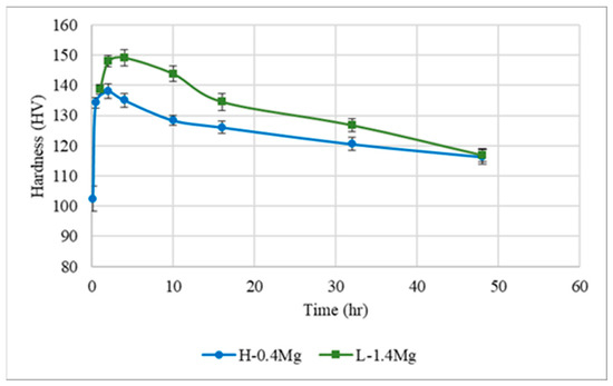 The hardness comparison of the investigated alloys is presented in Figure 3, which shows that the low Cu/Mg ratio alloy (L-1.4Mg) presents a higher hardness directly after the supersaturated solid solution (SSS) at the onset of the aging process, with a value of 122 Hv. In contrast, the high Cu/Mg ratio alloy (H-0.4Mg) only reached 102 Hv. The explanation for this difference lies in the high concentration of Mg in the low Cu/Mg ratio alloy, leading to the supersaturation of Mg atoms in the aluminum matrix, as indicated by the supersaturated solid solution theory [28]. This results in improved hardness, which continues to improve through the precipitate hardening theory, characterized by the accumulation of alloy elements to form different precipitates. This is due to the diffusion of elements within the alloys, leading to larger precipitates until they reach a uniform size and distribution. The peak hardness values of the L-1.4Mg alloy and H-0.4Mg alloy were 149 Hv and 138 Hv, respectively. Despite initially increasing, the hardness of both alloys eventually started to decrease. However, the hardness of L-1.4Mg was less than the SSS stage after 48 h, which can be attributed to an increment in the size of the θ precipitate relative to the S precipitate. The larger size of precipitates negatively affected the hardness due to an increased mismatch between the aluminum matrix and precipitates [11].