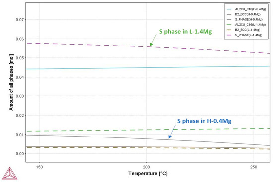 Thermo-Calc simulation showing the amount of S phase in H-0.4Mg alloy and L-1.4Mg alloy at the range of temperature from 150 to 250 °C.