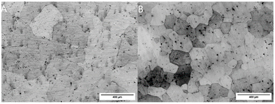 Optical Microscope images of (A) H-0.4Mg alloy and (B) L-1.4Mg alloy.
