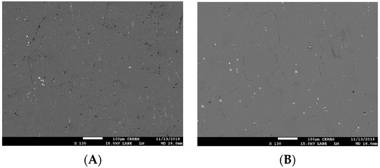 SEM images of alloys to show the S phase size: (A) H-0.4Mg alloy and (B) L-1.4Mg alloy.
