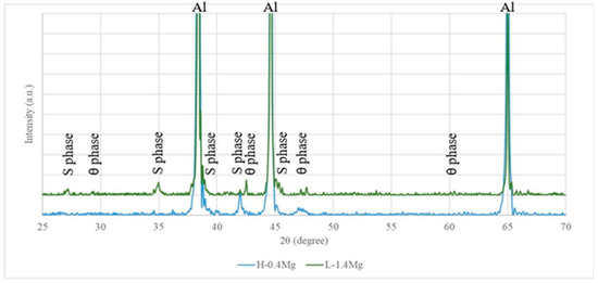 The optical micrograph of Al–Cu–Mg–Ag alloys with high and low Cu/Mg ratios provides valuable insight into the microstructure of the alloys. As shown in Figure 6A, the high Cu/Mg ratio exhibits an average grain size of approximately 205 μm, while the low Cu/Mg ratio, as depicted in Figure 6B, displays an average grain size of 139 μm. According to the findings, the alloys’ incorporation of Mg prevents recrystallization from occurring throughout the artificial aging process. The large size of the precipitates in the L-1.4Mg alloy may be responsible for the limited recrystallization size, as indicated by Figure 7. This leads to an increase in the mismatch between the lattice parameters of the alloy matrix and the S phase. In addition, this might affect the tensile result by increasing the average size of the S phase from 3 µm to 18 µm in the high Cu/Mg ratio alloy when the Mg concentration rose from 0.4 to 1.4. This observation is further supported by the X-ray diffraction (XRD) results, which show the presence of large-sized S phases separated at several planes, as shown in Figure 8. XRD results support the increase in Mg content in the L-1.4Mg alloy enhanced the formation of the S phase, as evidenced by the peak XRD at 2θ angles of 24° and 35°. As well, the XRD results show multiple peaks with a high intensity of the S phase in L-1.4Mg compared to H-0.4Mg. The limited recrystallization size can be explained in other ways as well though. Another that might be important is the L-1.4Mg alloy’s abundance of Ω phases, which are composed of Al–Cu–Mg–Ag. This, however, is outside the purview of this investigation. Our previous work showed that the mechanical properties of alloys with a high Mg content can be improved by increasing the Ag content, which suggests that the Ω phase may have a negative impact on the recrystallization process [29].